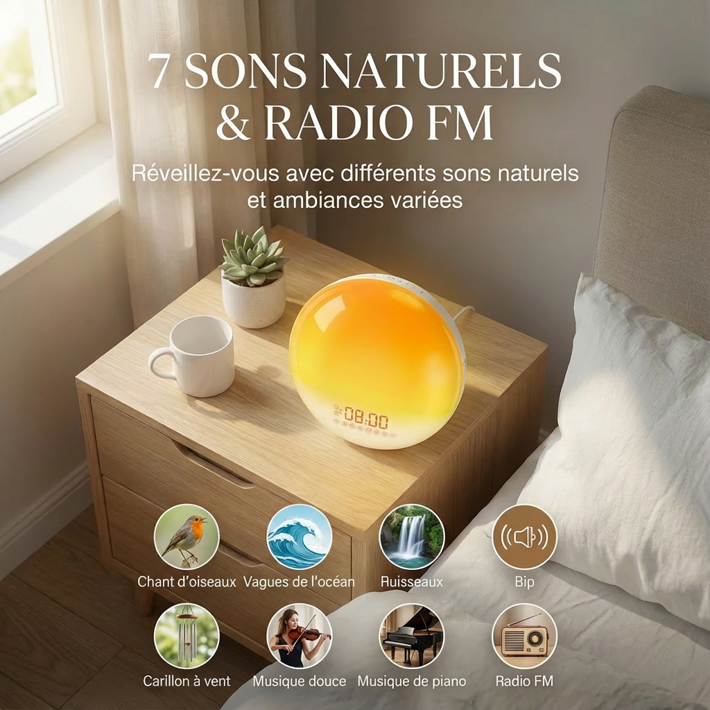Simulation naturelle du lever du soleil avec 20 niveaux de luminosité et 7 sons naturels
